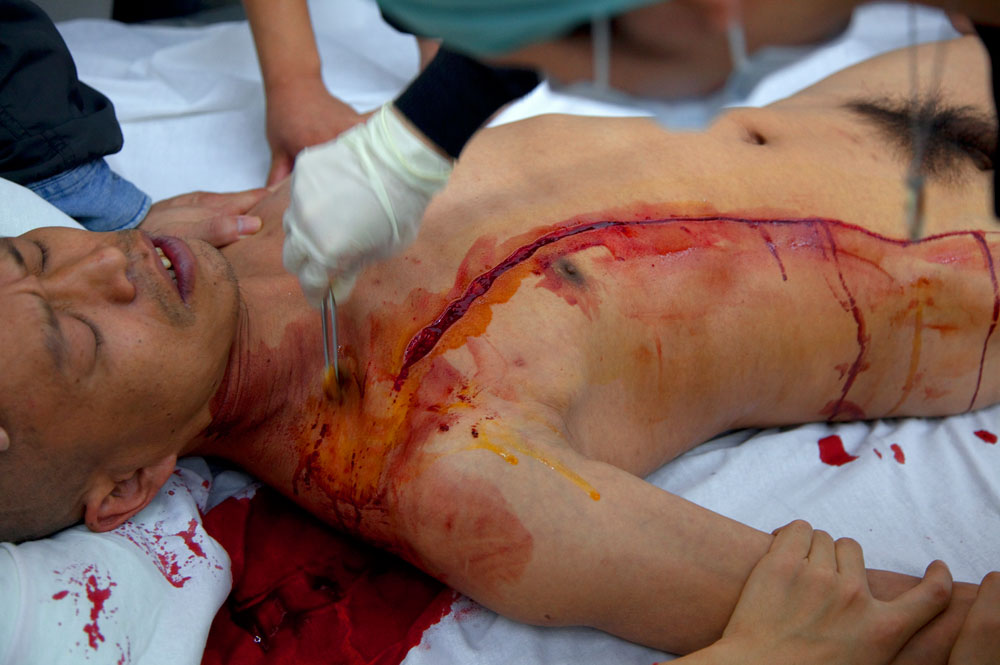 Het bloed bleek een rode draad in de expositie te zijn, want in de volgende ruimte stuit men op foto’s van een bloedende tegenhanger van het Chinese regime. De man in kwestie, He Yunchang, liet ‘een meter democratie’ in zijn lichaam snijden, nadat zijn vrienden eerlijk voor dit besluit hadden gestemd. Moraal van dit protest: China is nog ver verwijderd van de democratie.